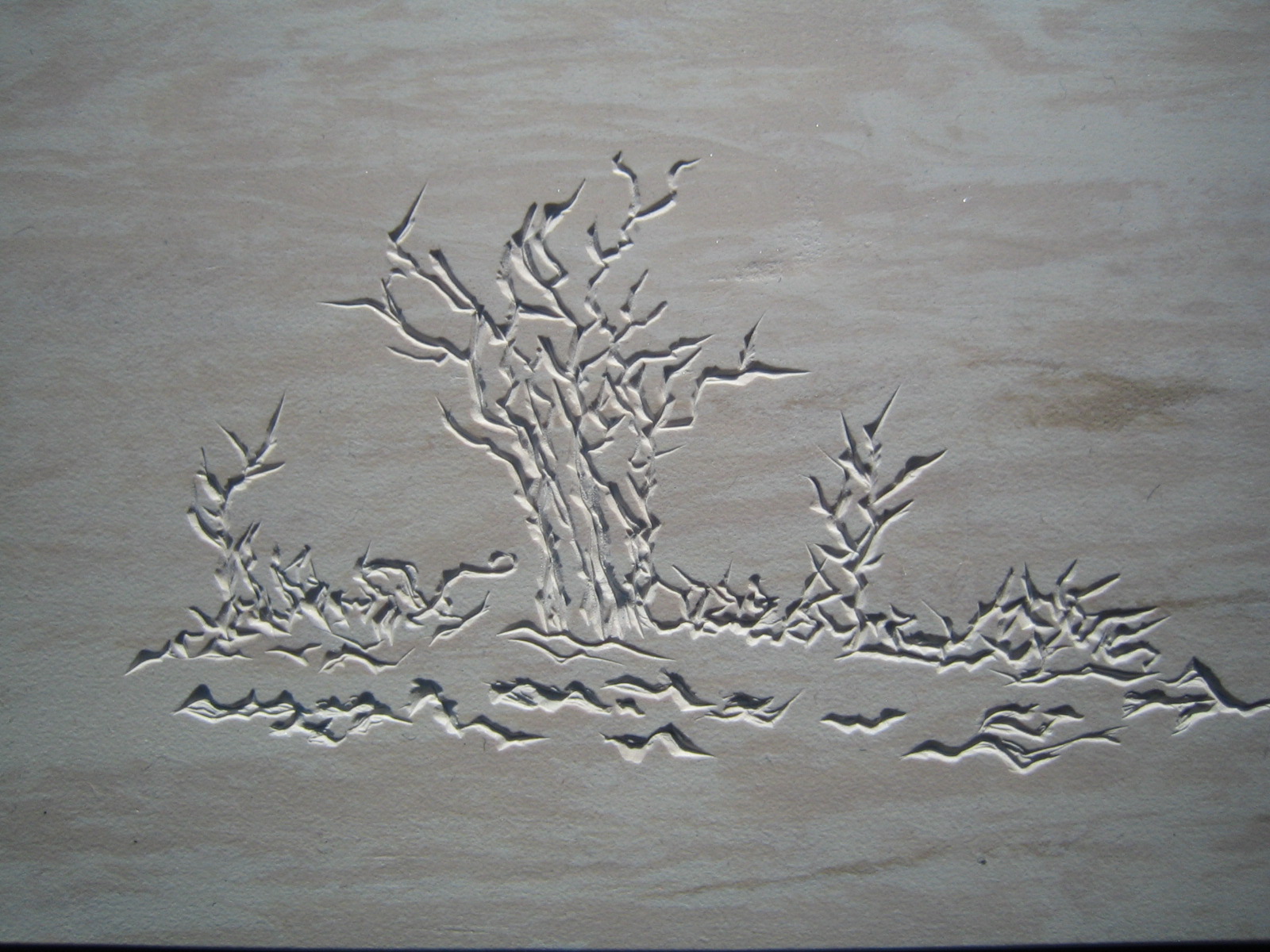 Most of the tree writing I have done in my own work have been drawn of my imagination, therefore end up as fictional trees. I do however draw inspiration from the real trees and forests that surround me (they have influenced many aspects of my work), so I use these as models and fodder for my imagination. In the last few years I have written these trees out many times with various mediums such as sumi ink, printmaking inks, watercolours, gouache, and of course with various grades of graphite pencils; I have applied these mediums with some very interesting hard tools such as the mapping & pointed pens, the cola pen, ruling pen, and various types of broad edge calligraphy pens. My trees have been rendered on many different types of fine papers, mylar, and vellum tracing. I’ve also carved my tree works onto linoleum with very sharp tools for what I call my inkless prints that I either work by hand or run through an etching press.